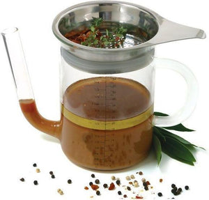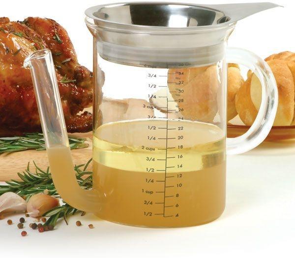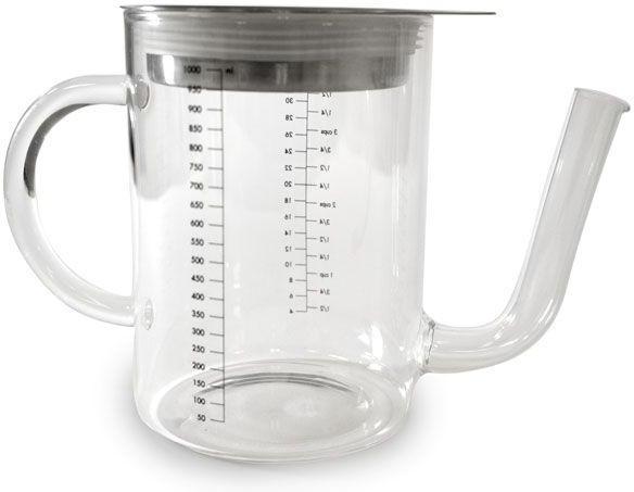Enjoy the flavor of lean gravy, sauces and pan juices. Easily separate fat from meat and juices while straining out large herbs and browned bits. Glass is high heat resistant and the stainless steel removable strainer retains food particles. Comfortable, easy hold handle for right or left hand use. Microwave and dishwasher safe.