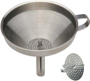 A stainless steel funnel with a detachable strainer is an addition to any kitchen. Mouth, 5.5 x 14cm Stem, .6 x 1.5cm Made of heavy duty stainless steel Perfect for herb infused vinegars, homemade wine and reusing cooking oil. Hand washing recommended.