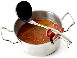 Heat resistant silicone pads clip onto the pot protecting against scratches while keeping utensils from slipping into the pot. Drips go back into the pan. Keeps countertops clean.