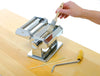 Now make your pasta at home! Made of chrome plated steel with nickel plated rollers. Makes pasta sheets up to 5.5” / 14cm wide. Cuts .06"/1.5mm pasta sheets, tagliolini or .25/6mm fettuccine. Clamp securely holds machine to table or counter top!