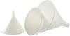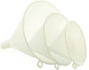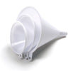 Set of three plastic funnels. Large Mouth: 4 x 10cm Stem: .5 x 1.25cm Medium Mouth: 3.5 x 9cm Stem: .4 x 1cm Small Mouth: 2.5 x 6cm Stem: .3 x .75cm.