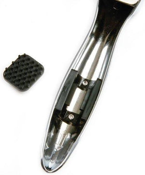 Features two compartments: one for pressing, crushing garlic and the other for slicing garlic thin with a simple squeeze. Includes cleaning tool.