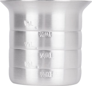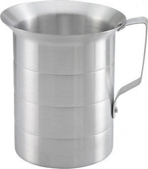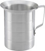 Measure the ingredients of your signature dishes with ease using this measuring cup. Made of heavy-duty aluminum, this 1/2 quart measuring cup is perfect for high-volume kitchens, bakeries or restaurants. Designed for no-spill pouring, this cup's seamless construction, large, riveted handle and capacity markings make measuring and pouring easy.