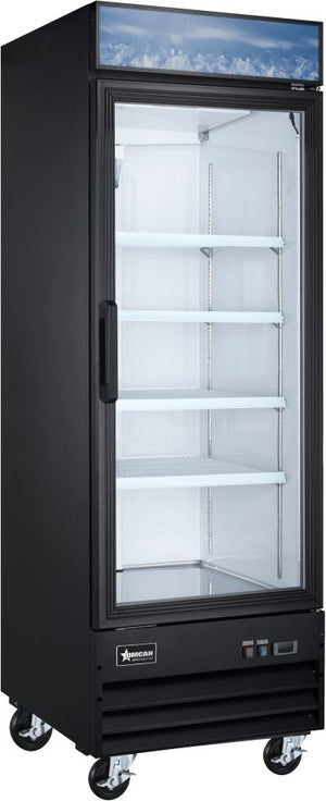 Introducing Omcan, a trusted name in commercial kitchen equipment, known for delivering top-notch products designed for durability and efficiency. The Omcan 12 Cu.Ft. Black Display Freezer With Single Glass Door - 51029 is the perfect addition to any retail environment, offering a sleek and stylish design that ensures your products are always displayed at their best. This high-performance display freezer is constructed with a coated steel exterior and an attractive aluminum interior liner with a stainless steel floor, providing both durability and ease of maintenance. The single glass door is self-closing, maintaining the internal temperature and enhancing energy efficiency.