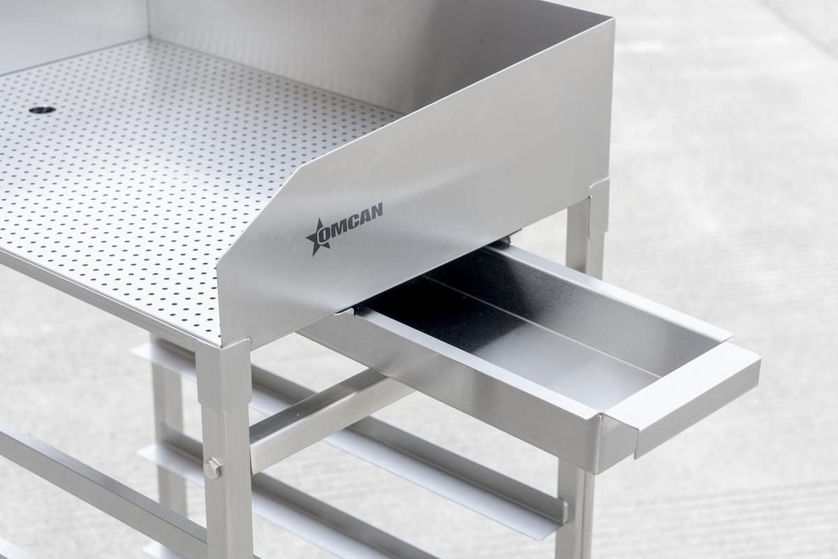 Streamline your fry preparation with the Omcan Stainless Steel French Fry Dump Station. Designed for high-efficiency and ergonomic use in fast-paced foodservice environments, this standing dump station features a 3-sided backsplash, perforated top, and oil reception cup to keep your workspace clean and organized. Its elevated design allows employees to quickly transfer fries from fryers into containers without bending, minimizing strain and boosting productivity. Perfect for adding optional heat lamps and seasoning prep, this unit is an essential addition to any commercial kitchen or concession setup.