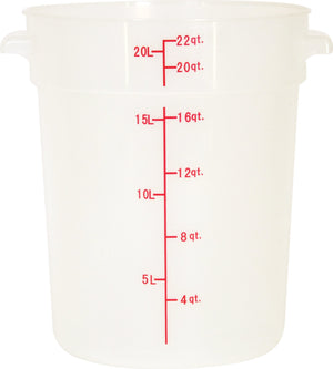 This durable Polypropylene round storage container, provides sanitation and longevity. It is resistant to acids, oil and alcohol. The container comes with both metric and imperial measurements. This container can withstand temperature ranges from -15°C to 80°C.