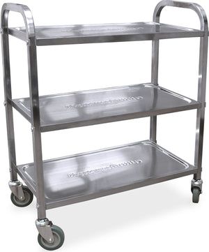 - Durable stainless steel cart with 3 shelves, 4 swivel casters (two with locks)