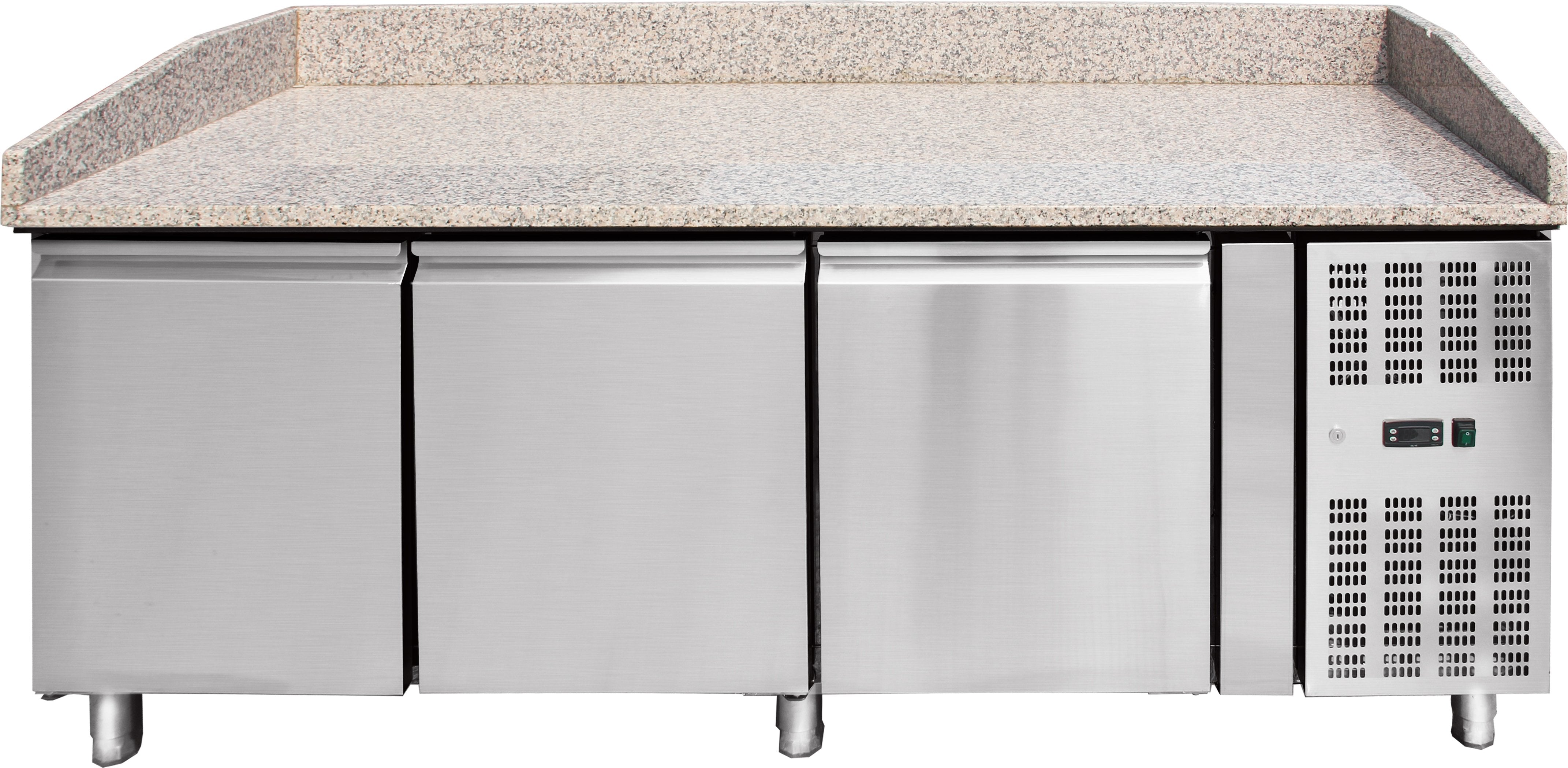 This pizza prep table features a granite top and is compatible with item #39595 topping rail.