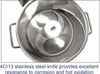 This machine is made with 304 stainless steel, it ensures that any components that touch food are clean. The knives are made with 4Cr13 stainless steel, which makes the knives more sharp and efficient. There is also a stainless steel bottom which can withstand heat.