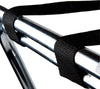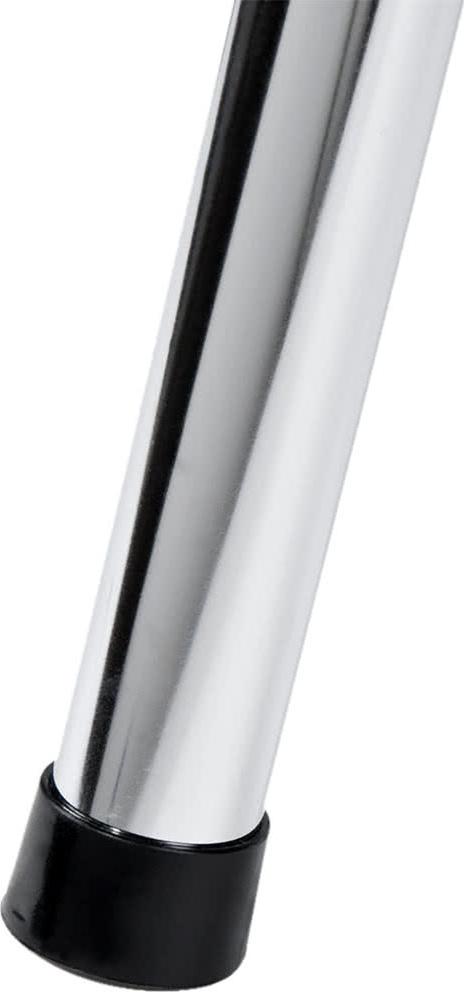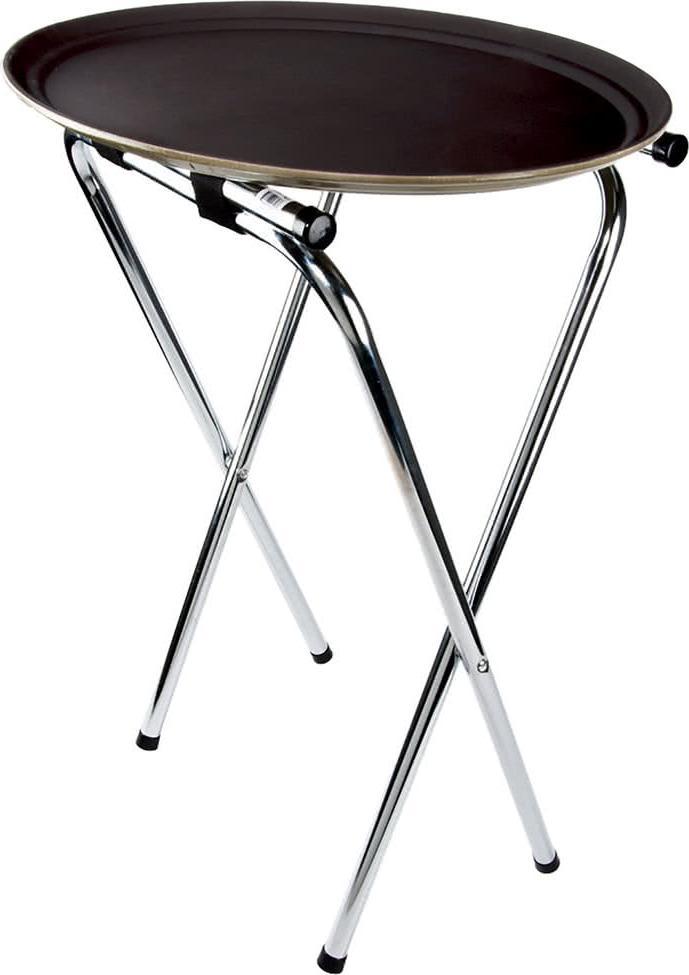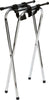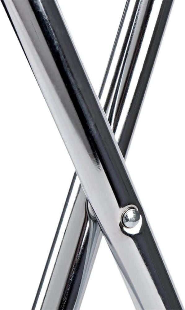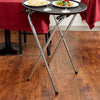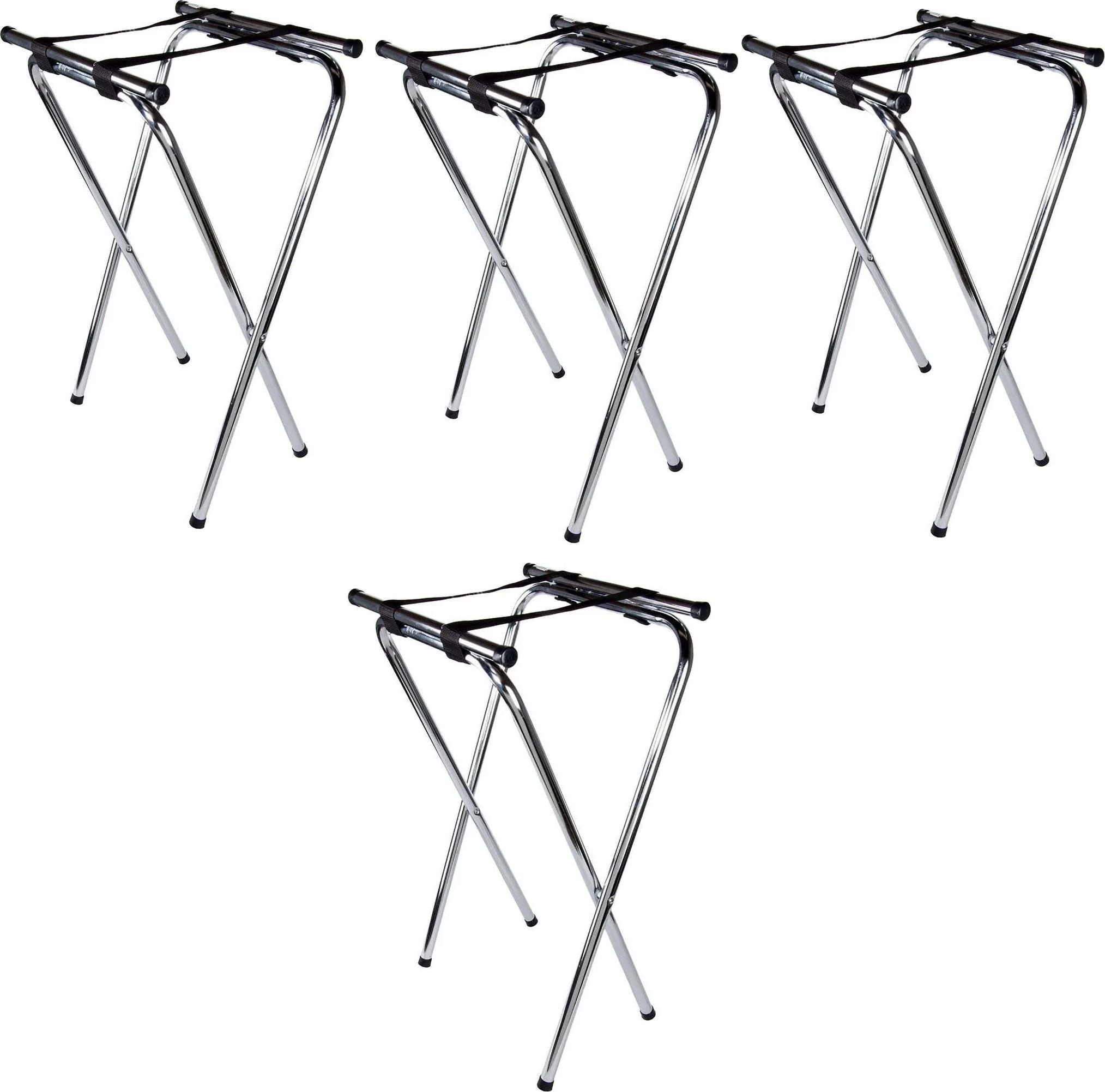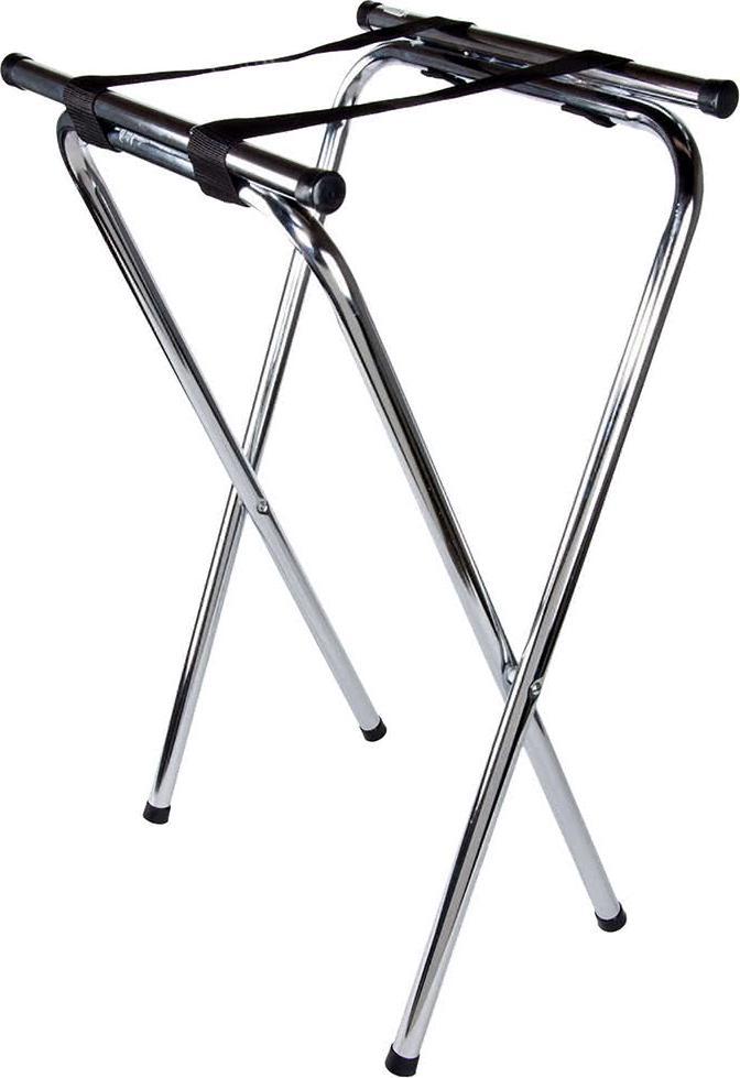 This 31" chrome tray stand is equipped with two stretched, secure belts on top to form a sturdy platform for your serving trays. It is designed to be foldable for portability and storage efficiency. The chrome finish makes it attractive and easy to clean.