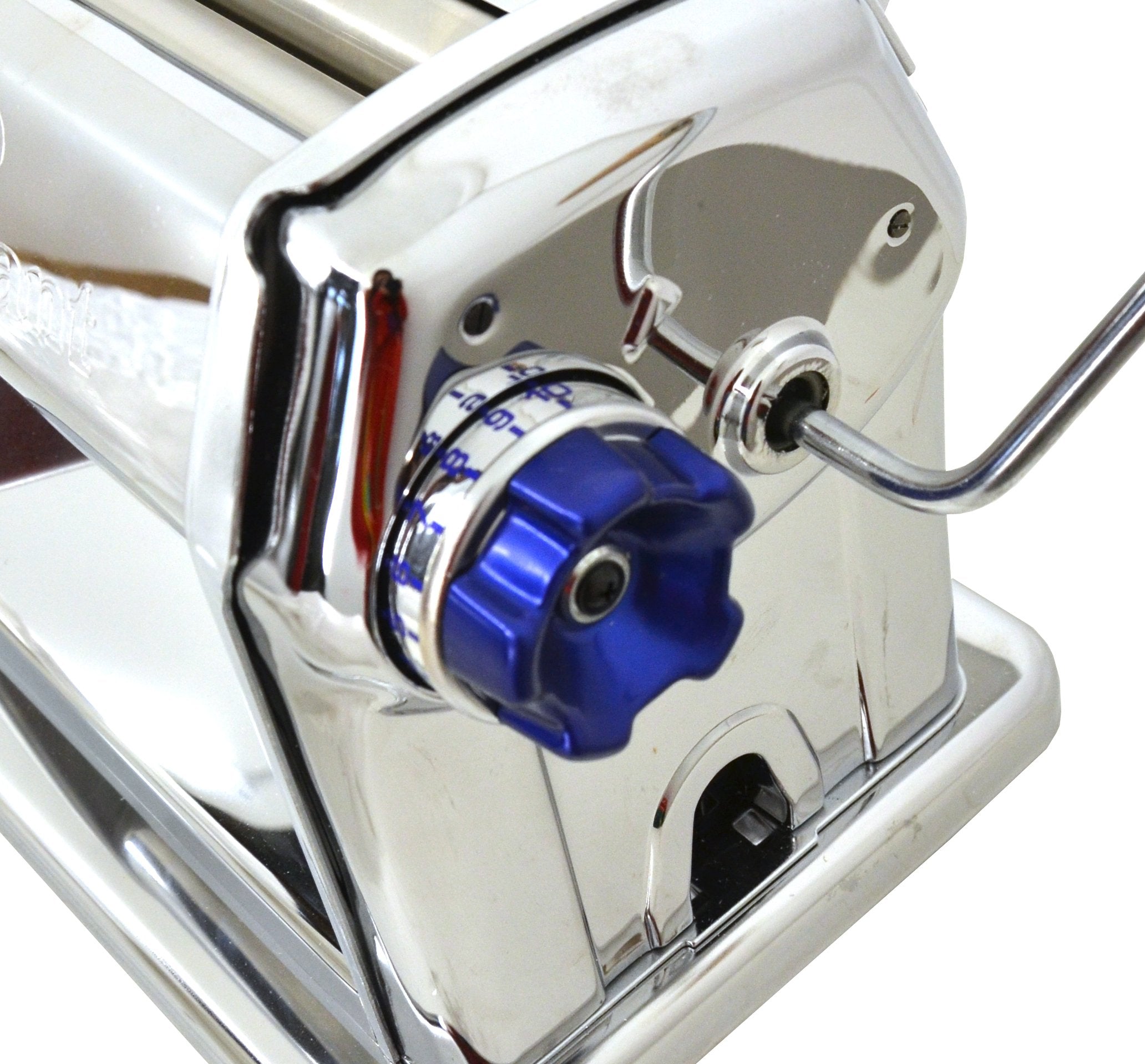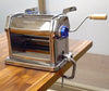 This model is ideal for restaurants and demanding home use. The body is stainless steel for easy cleaning. This unit is designed for flat noodle production and can be securely mounted on a table. This pasta sheeter also has 10 settings.