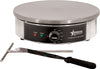 This countertop crepe griddle is an easy and efficient way to make delicious crepes. It features a cast iron plate, stainless steel body, temperature dial and indicator lights. Comes with crepe batter spreader.