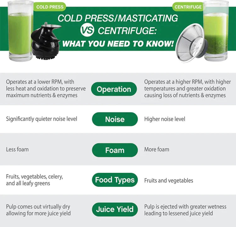45-65 RPM slow speed cold press juicing helps to reduce heat and air exposure to preserve vitamins, minerals, enzymes and antioxidants. Don’t just eat your fruits and veggies—juice them -- get a day’s worth of vitamins in one delicious juice. Makes fruit, vegetable and leafy green juices.
