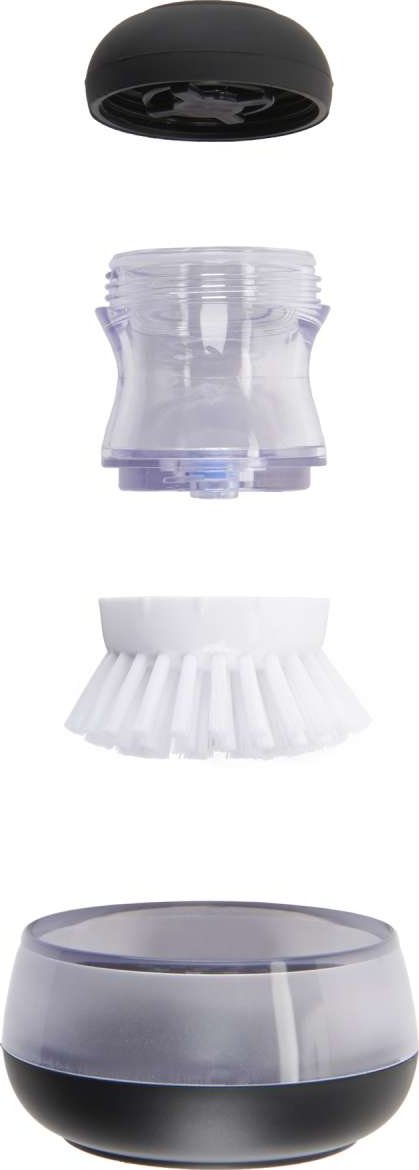 Includes a Soap Dispensing Palm Brush and a companion holder to catch excess water. Holder features a removable drip tray and built-in pour spout to keep counters clean and dry. A non-skid base keeps the holder in place. Brush has durable nylon bristles that are safe to use on non-stick cookware.