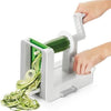 - Rotating handle turns fruits and vegetables to spiralize. Side handle advances fruits and vegetables through blades and folds up for compact storage
