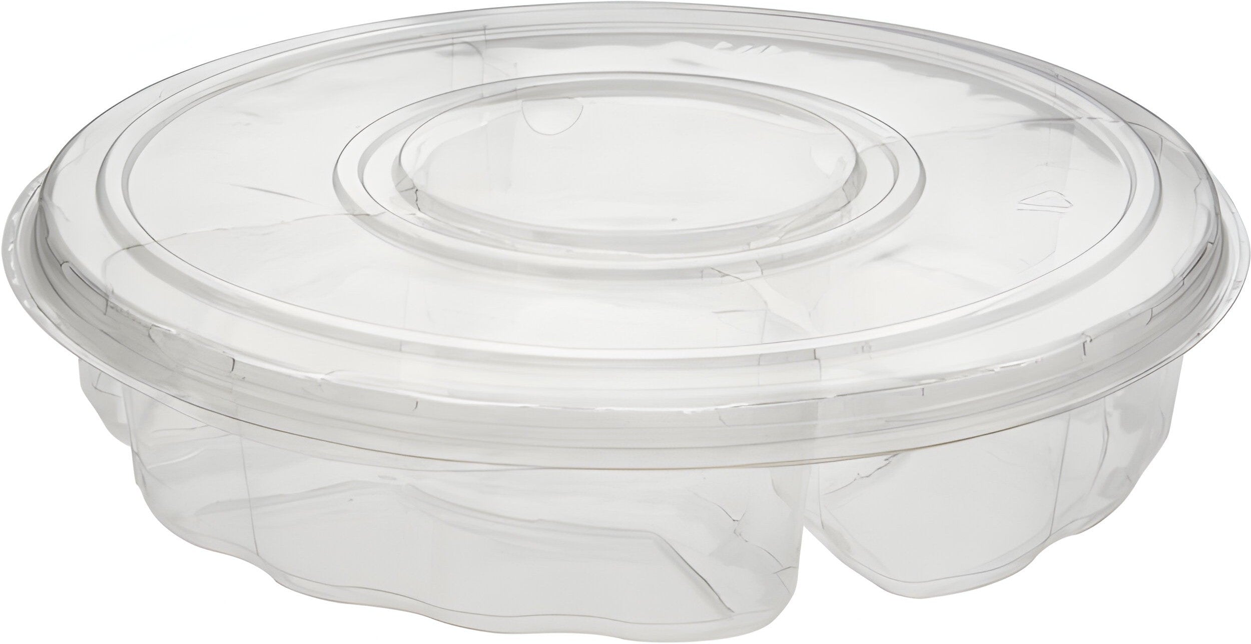 Pactiv Evergreen 13" Plastic 4 Compartment Platter, a versatile and practical solution for your catering and entertaining needs. Brought to you by Pactiv Evergreen, a reputable name in the industry, these platters are designed with precision and functionality in mind. Each case contains 60 plastic 4-compartment platters, providing you with a generous supply for serving a variety of appetizers, snacks, or party platters. The 13-inch size offers ample space for creative presentations, making these platters ideal for events ranging from casual gatherings to formal occasions. The innovative design of these platters features four compartments, allowing you to showcase a diverse selection of food items without the risk of flavors mingling. Whether you're serving an assortment of dips, vegetables, cheeses, or other bite-sized treats, these compartments help maintain the integrity of each item, enhancing the overall dining experience.
