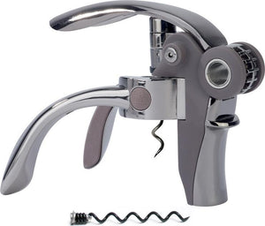 Lever style corkscrew fits all bottle necks and works well with all types of corks; a replacement worm is also provided. New dark chromed finish with a basalt-color soft touch inserts for a better grip.