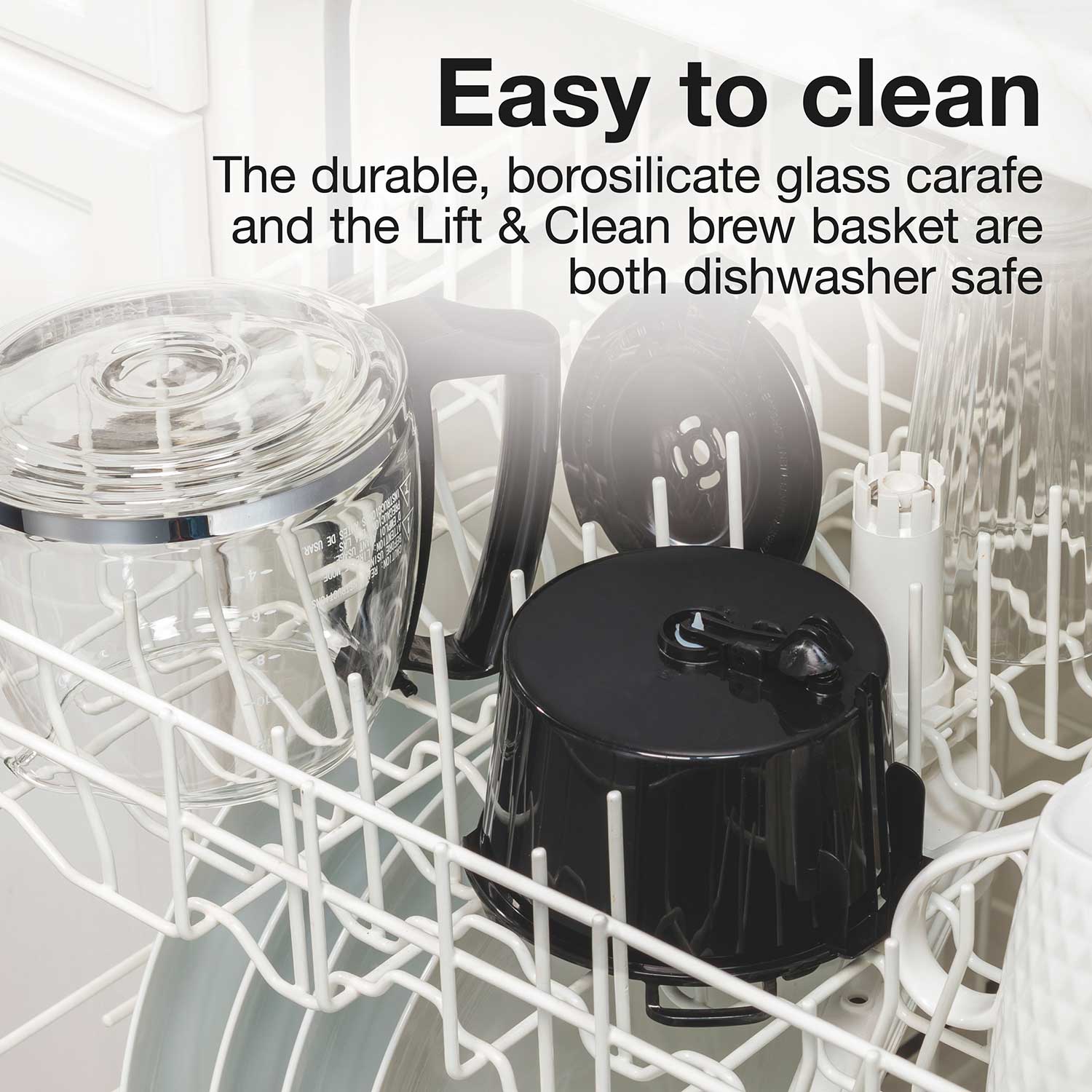 - Dishwasher Safe Components: Features a durable borosilicate glass carafe and Lift & Clean brew basket, both dishwasher safe. The nonstick warming plate wipes clean effortlessly, making maintenance a breeze.