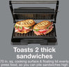 - Toast Multiple Sandwiches: Toasts up to 2 thick sandwiches at once or accommodates one long sandwich on its 70" square cooking surface.
