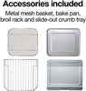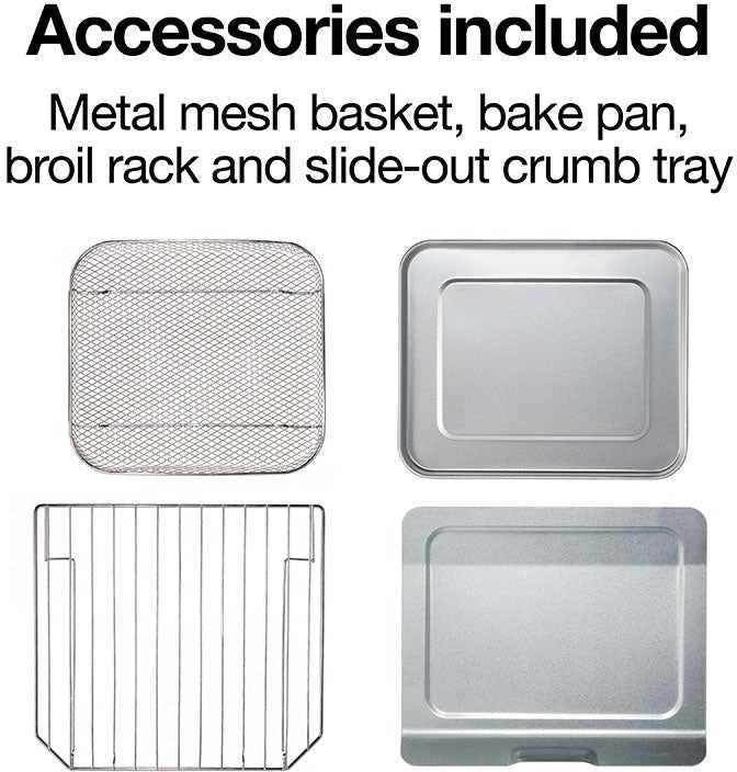 - Comprehensive Accessories: Comes with a mesh basket for air frying*, bake pan, broil rack, and slide-out crumb tray for easy cleanup.
