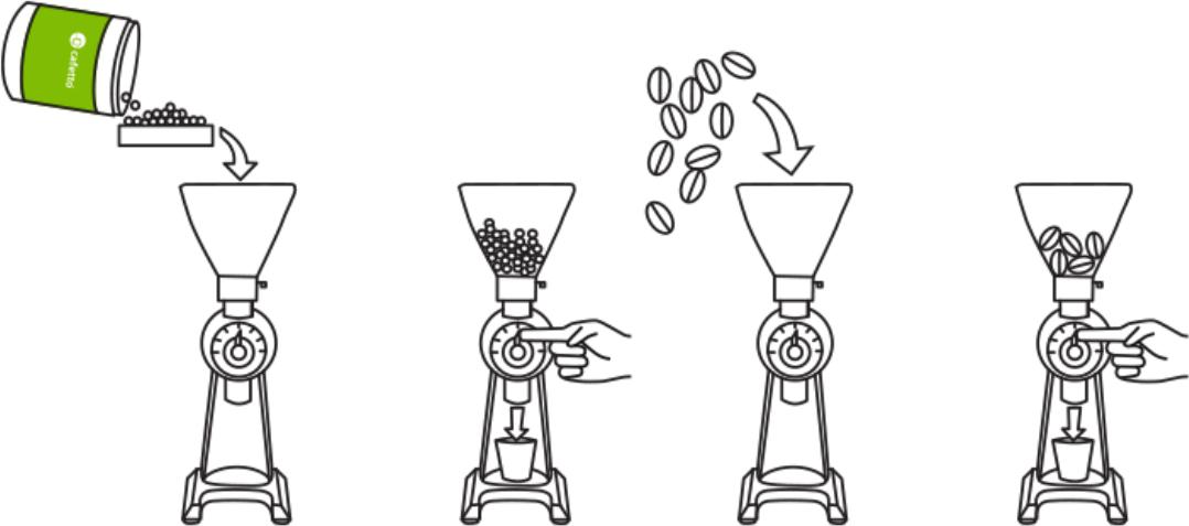 - Pour one capful of Cafetto Grinder Clean into the hopper