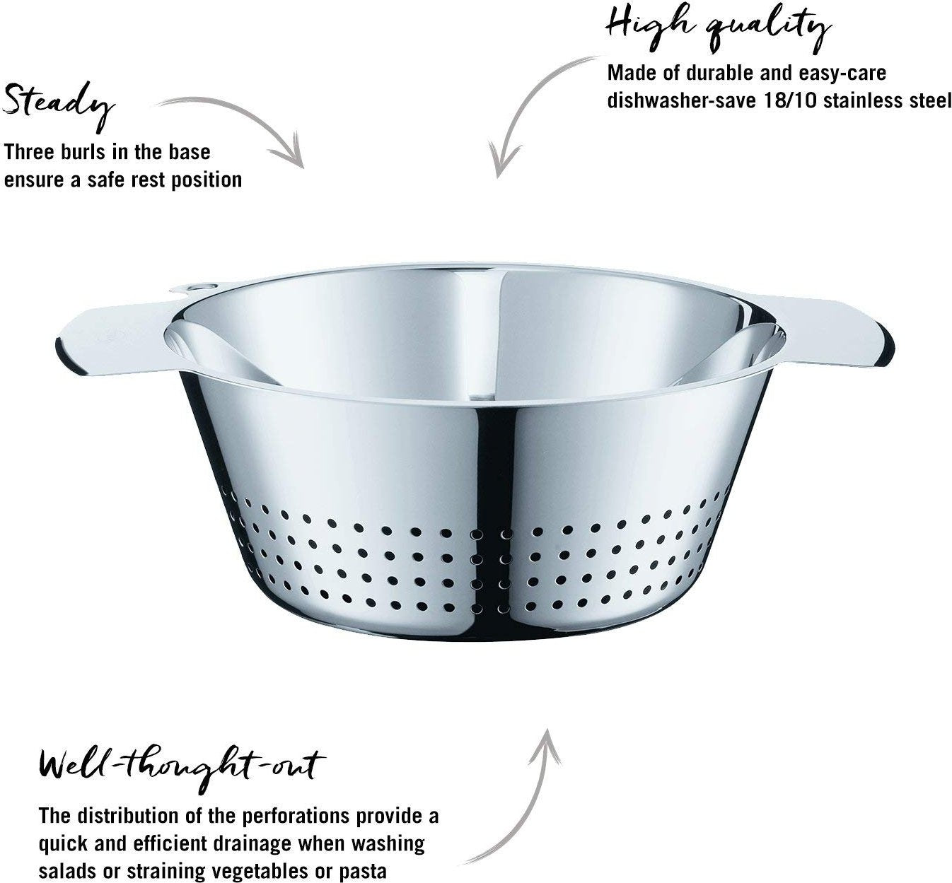 For straining vegetables and pasta and for washing salads. Evenly-distributed perforations over the side and base ensure quick and efficient drainage. Three burls in the base provide a steady rest position. Dishwasher safe.