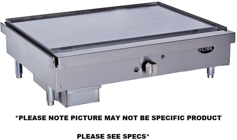 It provides an adjustable gas valve for precise temperature control, aided by a standing pilot for quick and reliable ignition. The built-in stainless steel grease trough collects excess grease and debris, keeping the workspace clean. Optional accessories include a spacer frame, safety pilot control, plate splash guards, a 1" thick griddle plate, an extra burner for increased cooking power, and a stainless steel equipment stand for added convenience. In summary, this Royal griddle is an excellent choice for teppanyaki kitchens, offering durability, powerful performance, precise controls, and ample cooking space
