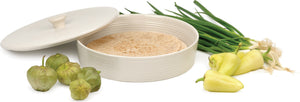 Keep tortillas warm in this white glazed 10″ diameter stoneware tortilla warmer. Microwaveable, lead-free and oven safe up to 350°F / 176°C. Also great for baking brie and keeping crêpes or pancakes warm. Dishwasher safe.