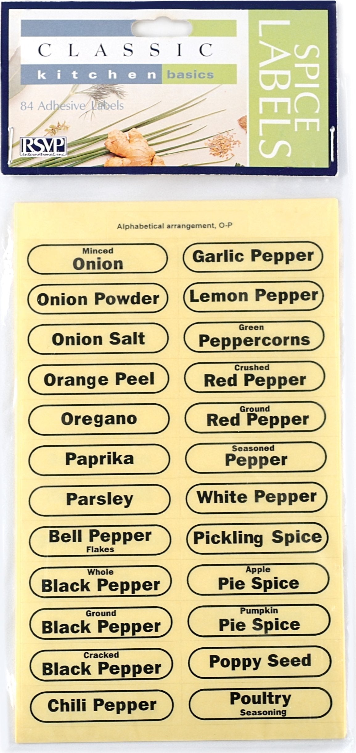 Stay organized with this 96-piece label set which includes 84 pre-printed spice and herb labels. The large bold font is easy to read so you can locate what you need in the kitchen quickly. 12 blank labels for you to write in additional spices and information. The versatile adhesive spice labels are perfect for either glass or stainless-steel spice containers. The clear, rectangular labels measure 2 inches wide and half an inch tall.