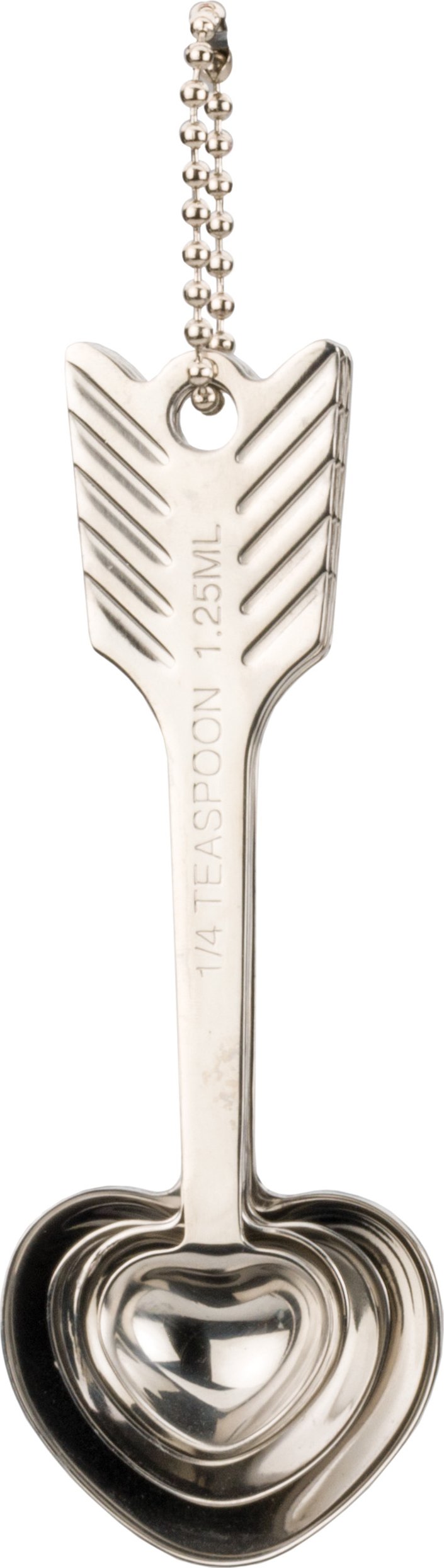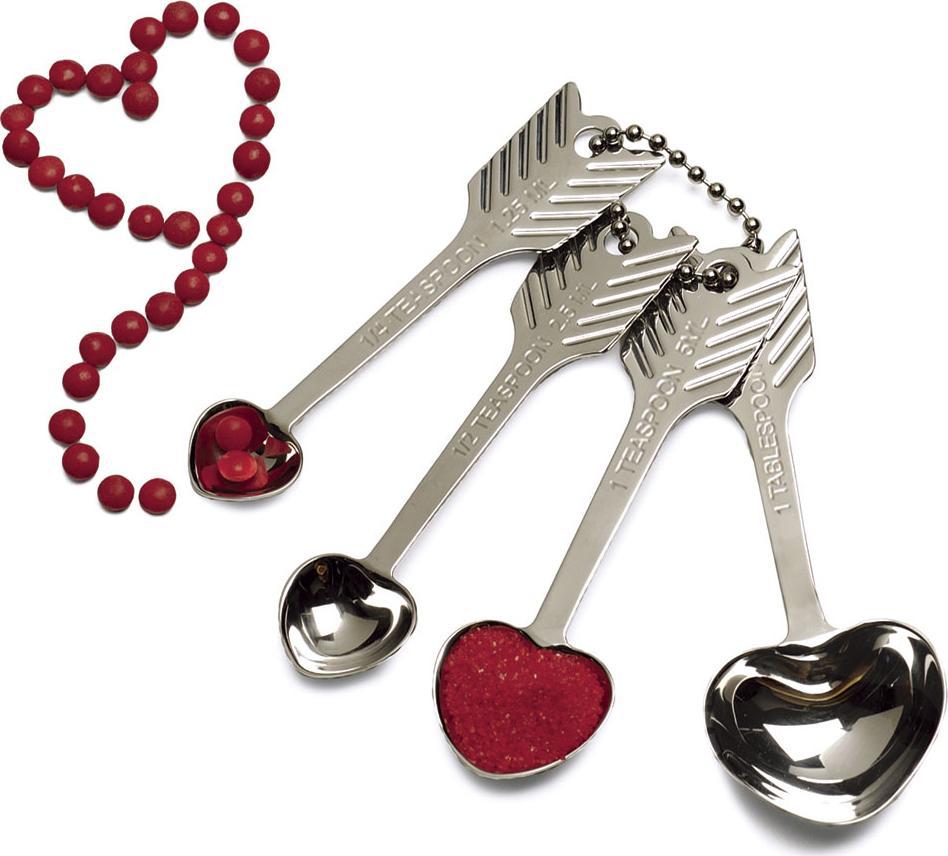 Our set of whimsical spoons features a feathered bow-and-arrow design on the handles and heart-shaped spoons in 1 Tbl., 1 tsp., 1/2 tsp. and 1/4 tsp. capacities. Constructed of highly-polished, dishwasher-safe 18/8 stainless steel. Each spoon is 5.5″ long overall.