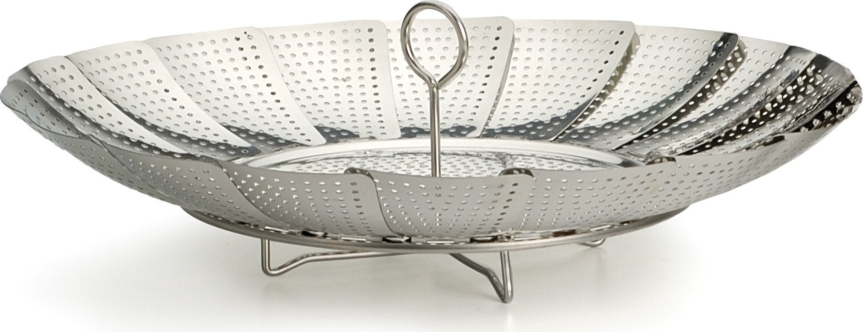 Hundreds of precision pierced holes allow for efficient steaming. The center post is extra long, removable and topped with an easy-grip ring. The collapsible bottom feet make storage a snap. Made from dishwasher safe 18/8 stainless steel with a 9″ diameter.