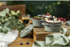 Cast iron is great at keeping your food at the perfect temperature for a long time, and the citron-colored ceramic dishes complement the yellow Cocottes on the table. A match made in heaven, just like apple crumble and ice cream.