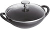 Experience the time-honored tradition of cast iron cooking with the Staub 6.5" Cast Iron Wok in sleek black. Perfectly sized for small portions, this versatile wok is ideal for browning, braising, and roasting. The enameled cast iron construction ensures excellent heat retention and distribution, while the black matte enamel interior enhances the cooking process by promoting superior browning. The smooth enamel bottom allows for use on all types of stovetops, including gas, electric, and induction. The wok is also oven safe up to 500°F, making it perfect for a variety of cooking methods. The accompanying glass lid helps to retain moisture and monitor cooking progress without lifting the lid.