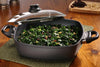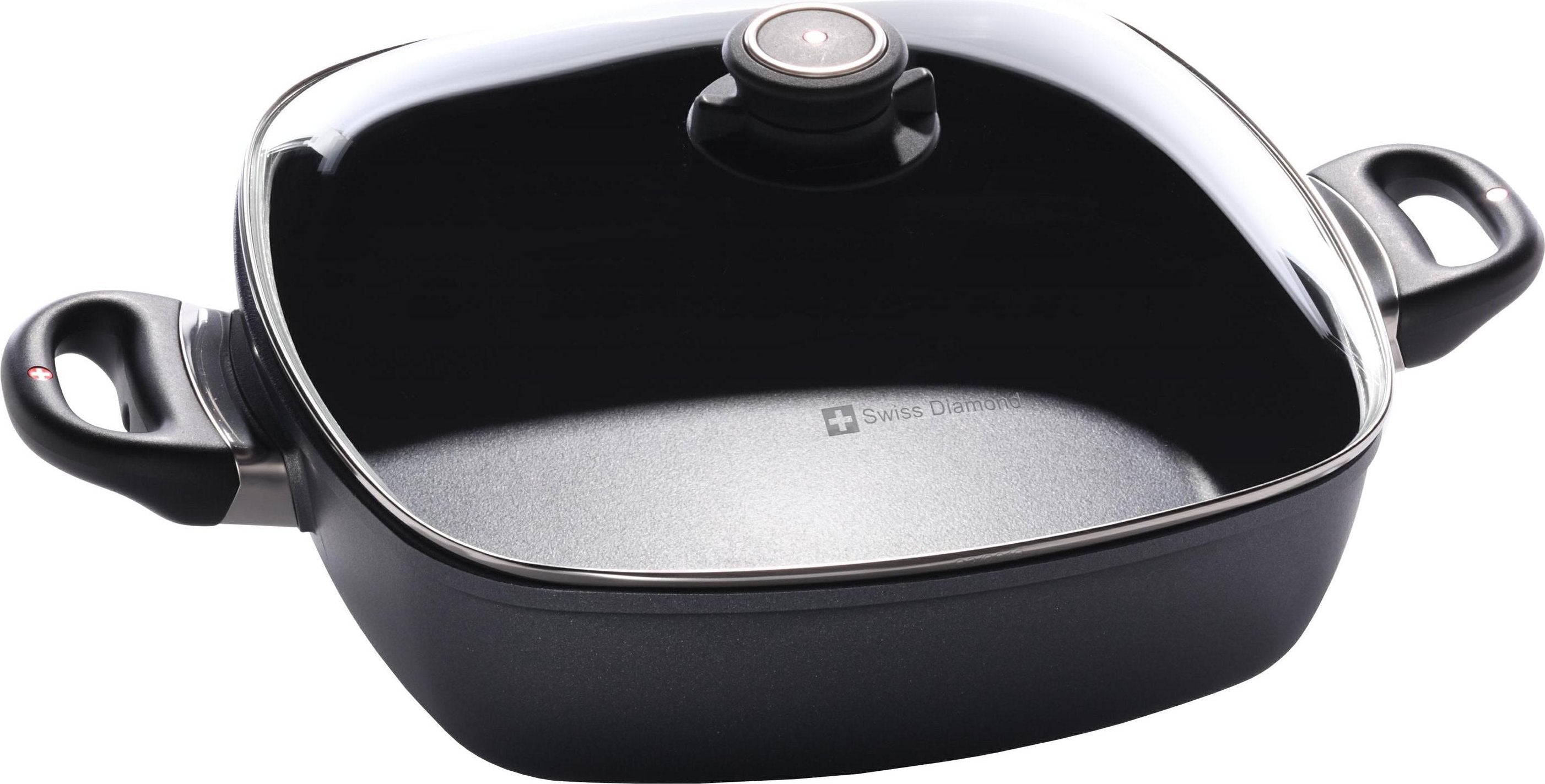 Swiss Diamond is changing the way home chefs cook every day. The Nonstick Square Casserole with Lid is no exception. Its square shape allows for a larger 5.3-qt cooking capacity, as well as easily fitting next to other pans in the oven. This pan is perfect for that big Thanksgiving meal where you already have enough to wash: take this casserole dish from the stove top to the oven (safe up to 500 F) to the dinner table for serving. Once dinner is done, Swiss Diamond's patented diamond-reinforced nonstick coating helps with the cleanup too. Simply use warm water and soap and the pan comes clean with ease. Use the included heat tempered lid to control the moisture level in and out of the oven.