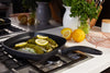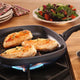 The cookware's pressure-cast aluminum construction provides for uniform heat distribution with no hot spots or warping - even if the pan is placed under cold running water right off the stove. Each piece has a perfectly flat base for use on any ceramic, gas or electric cooktop (induction series also available.)