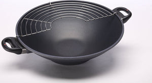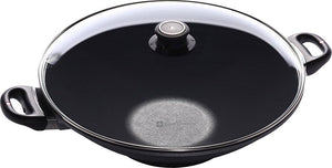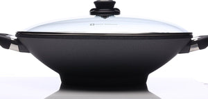The Swiss Diamond 14 inch Nonstick Induction Wok is ready for all your delicious Asian cuisine recipes. This wok is perfect for cooking family size Stir-fry, Lo Mien, or Moo Goo Gai Pan meals. Swiss Diamond's patented nonstick coating is perfect for healthy cooking as it requires little to no oil, and allows easy clean-up - no more scrubbing or soaking! With its flat bottom and vented tempered glass lid, this pan also makes the perfect large chefs pan. This induction nonstick wok, like all other Swiss Diamond Induction Cookware is guaranteed not to rattle on the cooktop, and carries a Limited Lifetime Warranty.
