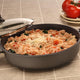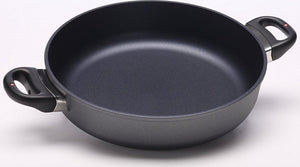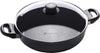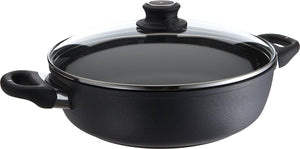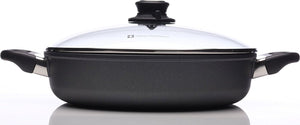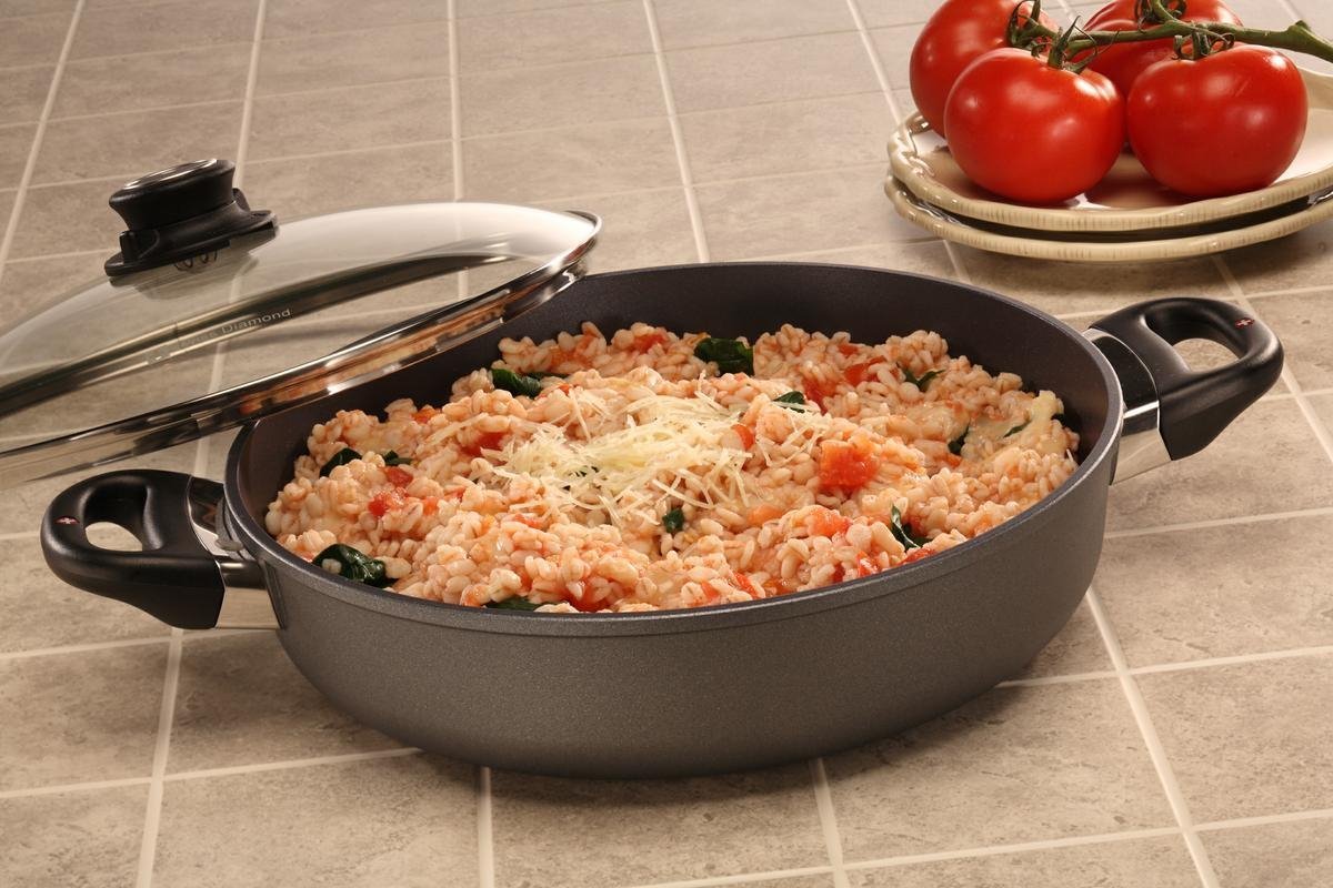 Perfect paella, creamy risotto - the Swiss Diamond 11 inch (3.7-quart) Sauteuse will be your new go-to piece of cookware for one-dish meals. With a cooking depth of approximately 2.4 inch, it sits comfortably on an oven rack and is the ideal size for easy stirring. Swiss Diamond's patented nonstick coating is reinforced with real diamond crystals to provide excellent durability and performance. No more scrubbing or soaking - all you need is warm soapy water to get rid of stubborn food particles. The heat-tempered glass lid contains a steam vent for innovative moisture control. Dishwasher-safe, but we recommend hand washing. Induction version sold separately.