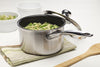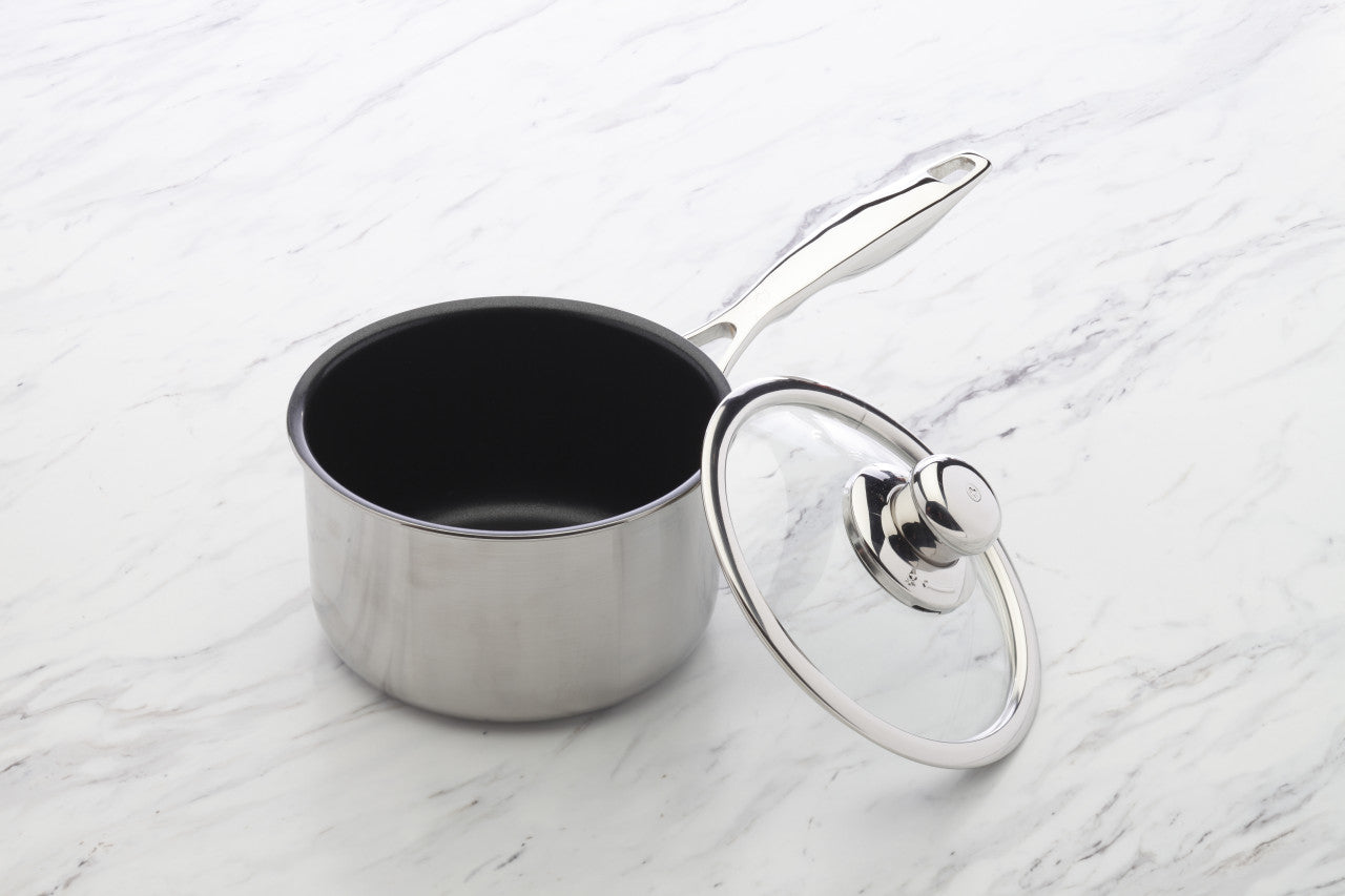 Thanks to Swiss Diamond's XD nonstick coating, this Nonstick Clad 2.1 quart (6.3") Saucepan is ideal for simmering soups, steaming vegetables, or even melting delectable chocolate sauce. With superior performance and a beautifully-sleek stainless steel body, this saucepan is a must-have for any busy kitchen. With see-through lids made of heat-tempered, oven-safe glass, you can cook until your heart is content and sneak a peek without releasing much-needed moisture. The lid features a stainless steel cast arch-style handle for ease of lifting on and off the cooking vessel. The lid also features a single-steam release valve to ensure that the lid will not bounce and rattle during cooking.