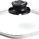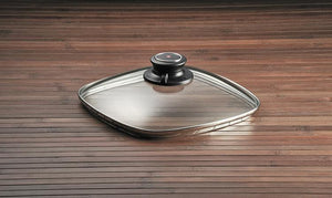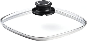 Featuring a steam vent that can be opened and closed to release or contain steam, this 8 x 8 inch (20x20 cm) glass lid is made of durable tempered glass. It is created to cover the Swiss Diamond Square Saute Pan, both induction and standard models. This universal lid will also fit any 20cm square pan, although a perfect fit cannot be guaranteed except with Swiss Diamond products. The cover's stainless steel rim provides a close fit. It can be used in the oven up to 260 C (500 F). As with any glass item, please avoid exposing it to thermal shock, including putting a hot lid under cold water.