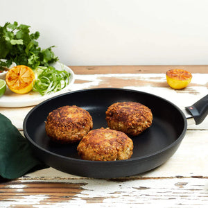 The cookware's pressure-cast aluminum construction provides for uniform heat distribution with no hot spots or warping - even if the pan is placed under cold running water right off the stove. Each piece has a perfectly flat base for use on any ceramic, gas or electric cooktop (induction series also available.)