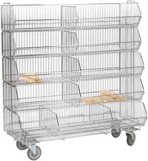 Display Bin Merchandiser, mobile, 36"W x 18"D x 52"H, (1) 20" bin, (2) 18" bins, (2) 16" bins, 100 lbs. capacity each bin, wire construction, chrome finish, dolly base with swivel casters (2 braked). Actual item may differ from image.