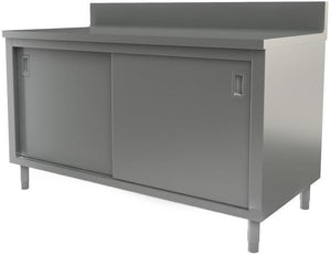 Servery Work Table, cabinet base with sliding doors, 54"W x 30"D, flat top with H-style hat channels, 6"H backsplash, (2) sliding doors, adjustable intermediate shelf, reinforced frame, full welded stainless steel construction, 6" adjustable stainless steel legs. Actual item may differ from image.