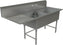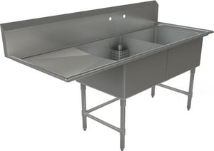 Sink, 2-compartment, 75"W x 30"D x 45"H overall size, (2) 24"W x 24" front-to-back x 13" deep compartments, (1) 24" left drainboard, 10"H backsplash, (1) set of splash mount faucet holes with 8" centers, 1-1/2" diameter bullnose edge on front & sides, (2) corner drains, includes (2) overflow tubes & (2) 8"H perforated drain guard assemblies, 18 gauge stainless steel construction, galvanized legs with side & rear bracing, adjustable bullet feet, cNSFus, KD. Actual item may differ from image.