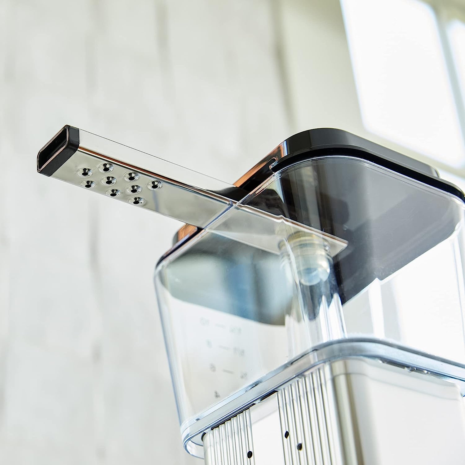 - PRECISE ENGINEERING The boiling action moves the water up the glass tube, where it flows into the outlet arm and pulses over the brew basket, blooming the coffee grounds in a manual pour-over style.