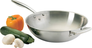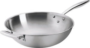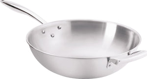 Three layers of metal are seamlessly bonded together - bottom layer of stainless steel, a mid layer of aluminum and top layer of stainless steel alloy with superior thermal conductivity. This pan has a 6 mm aluminum sandwich base for fast even heating. The hollow tubular handle resists heat transfer and is secured to pan with rivets.