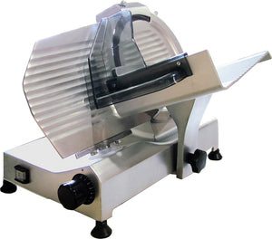 This slicer has an anodized aluminum alloy body. The high carbon steel blade is hard-chromed, with a hollow ground taper for extended sharpening and blade life. This belt-driven machine offers exceptional cutting consistency and durability. The carriage moves smoothly on ball bearings allowing effortless cutting of deli meats and vegetables. Easy to disassemble for quick cleaning. Perfect for low volume operations. ETL certified. Made in Italy.