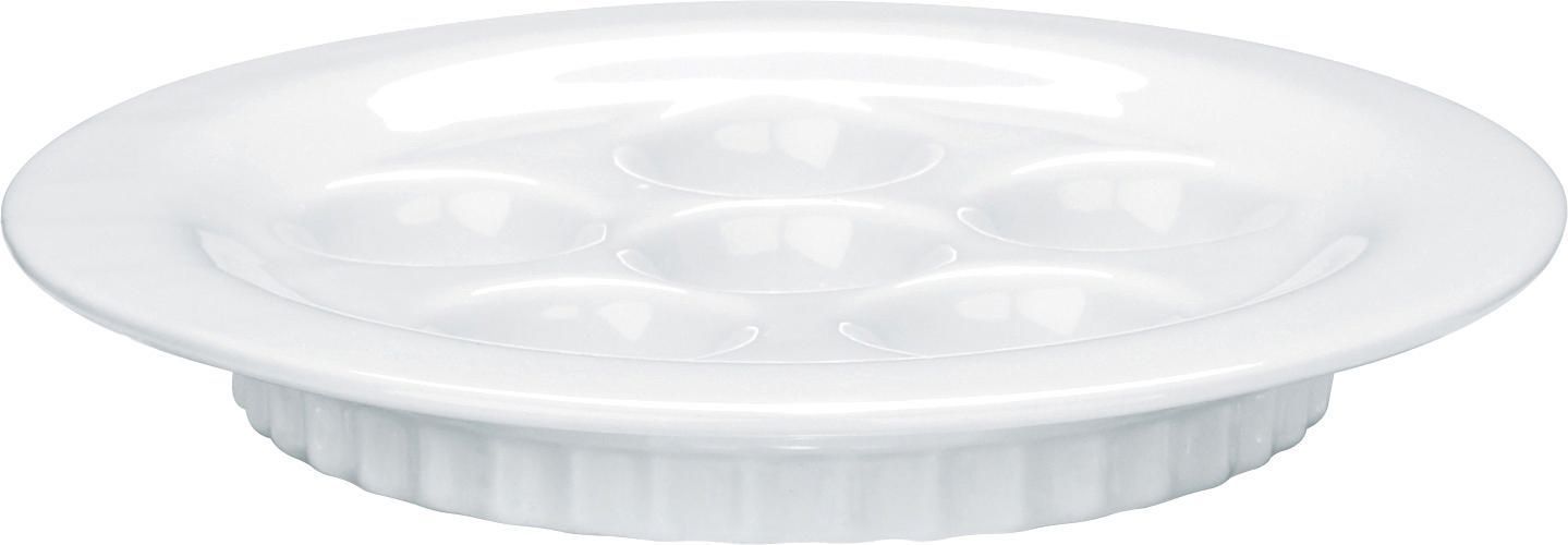 This set of four white, stoneware, ceramic escargot dishes is dishwasher, microwave and oven safe. These traditional dishes, by Trudeau, are perfect for baking and serving escargot whether with cheese or just a simple garlic butter sauce.