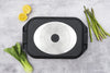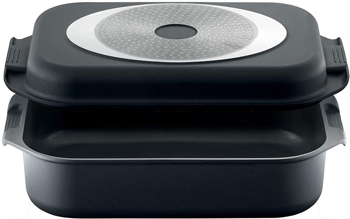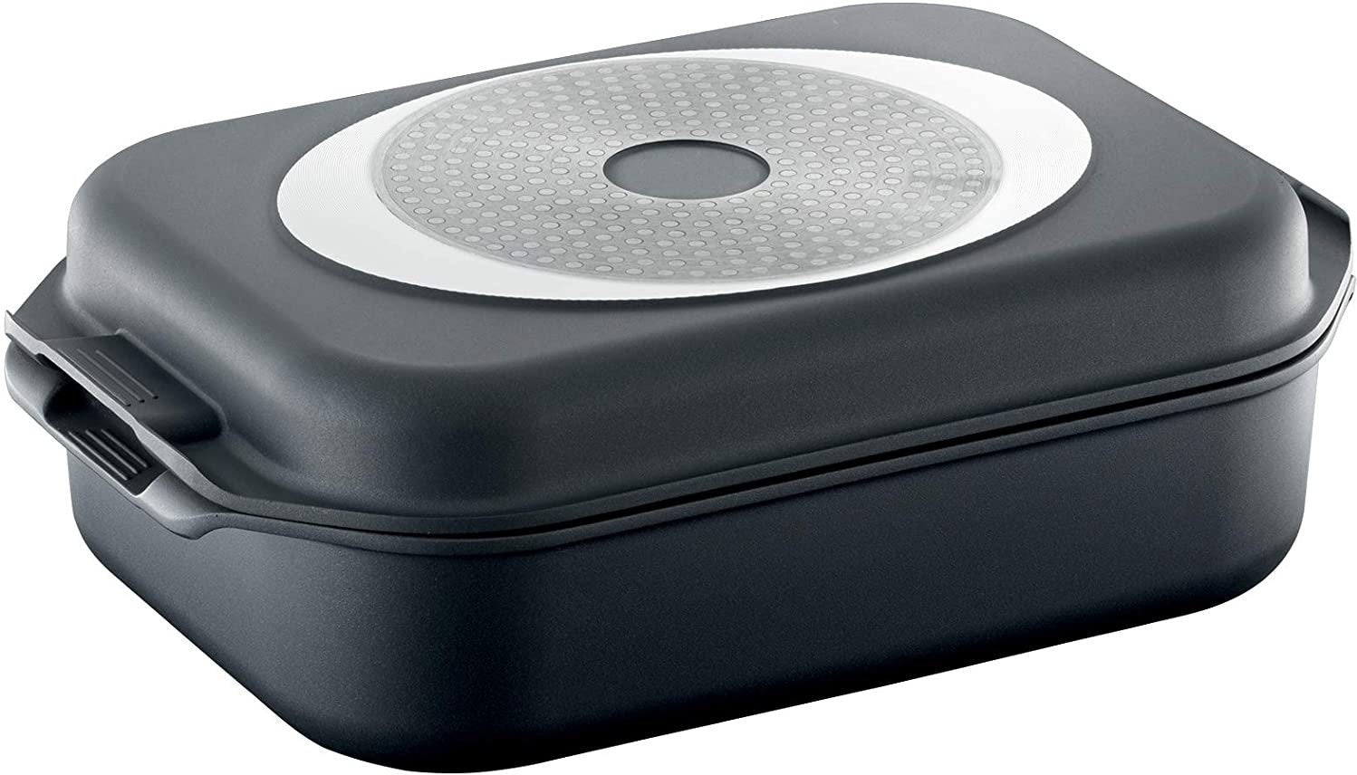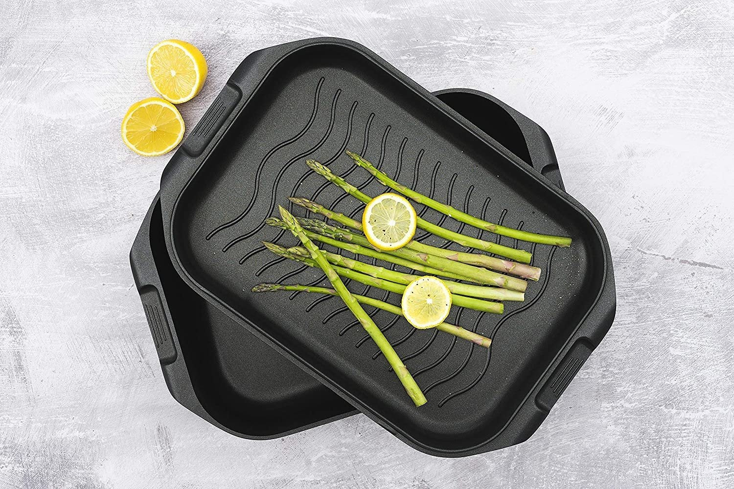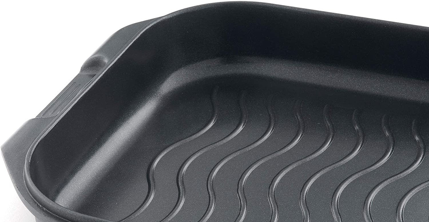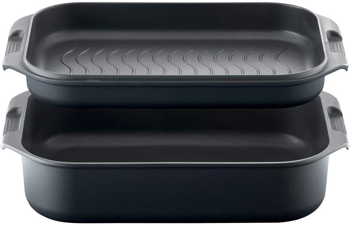 The Trudeau Heroic 2-In-1 Roaster Set can be used as a roaster (lid included) for no-mess cooking in the oven or a raised ridge grill pan to sear steak, veggies and fish with authentic grill marks. The hard wearing 3-ply non-stick coating provides for fast and simple cooking, long-lasting food release and no-fuss cleaning.