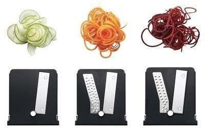 • 3 interchangeable stainless steel blades create perfect ribbons and noodle cuts