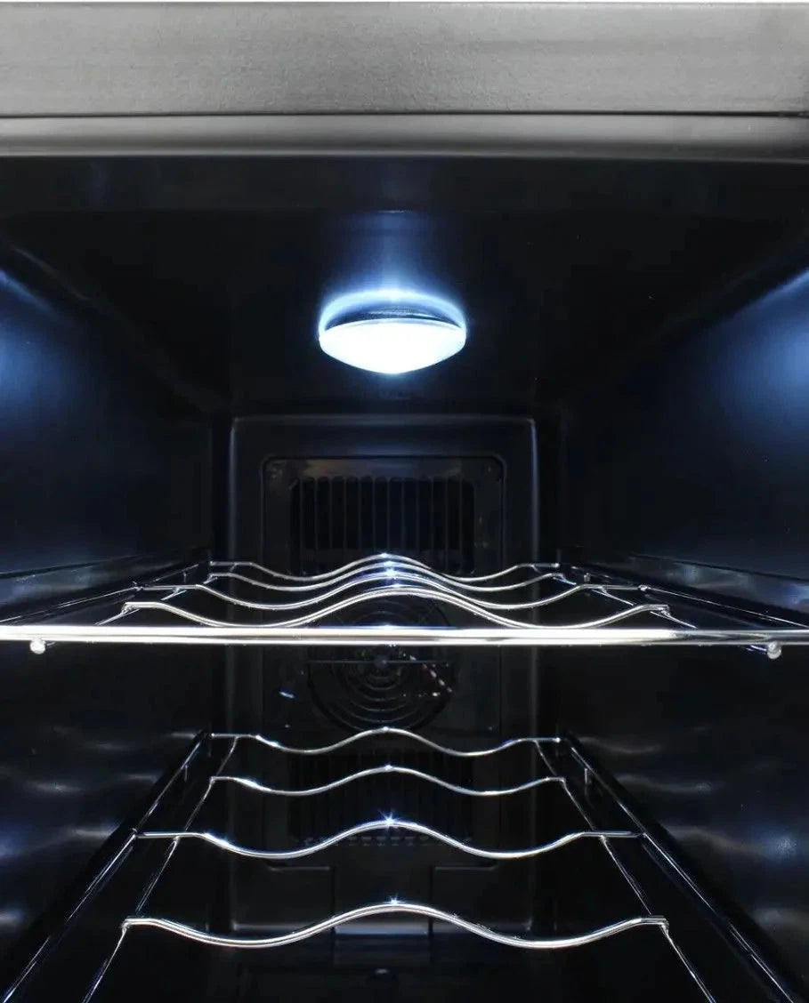 - Dual-pane glass door with recessed handle adds a touch of sophistication.